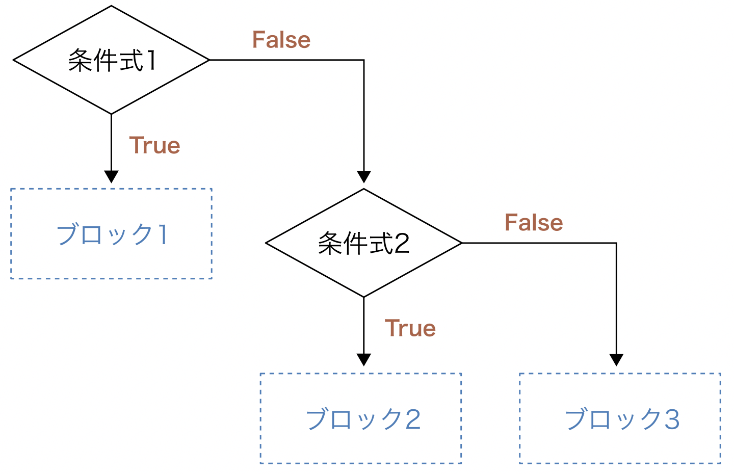 elif はelse ifの略であり、elif 条件式 は「もしここまでのブロックを実行しておらず、条件式が真ならば」という意味である。
