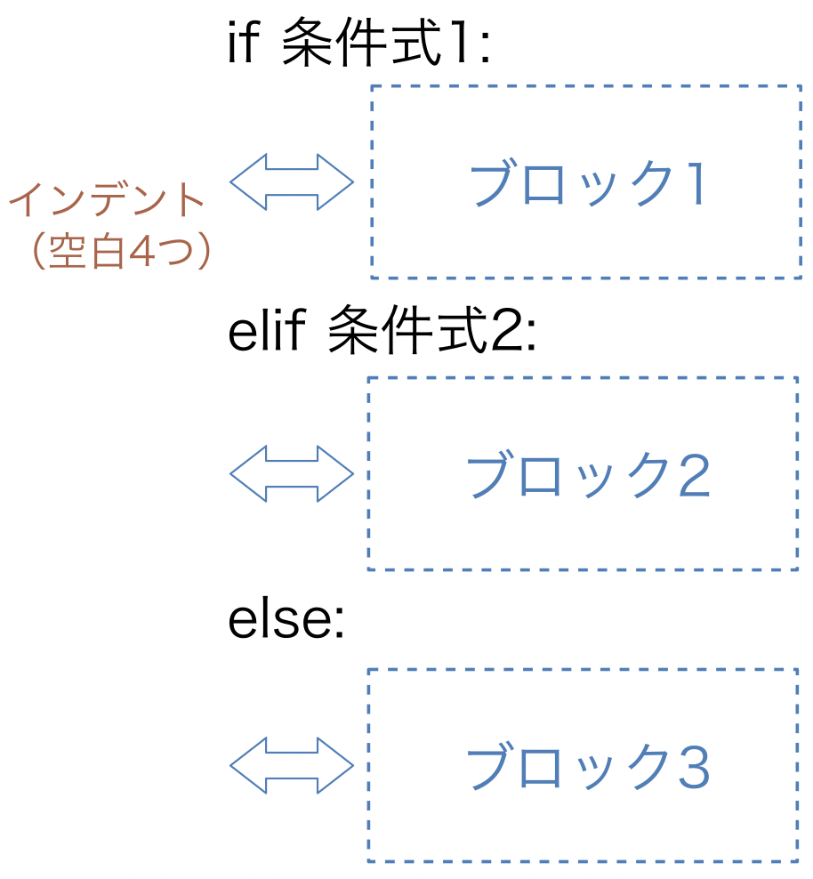 いくつか補足する。まず、if文だけの条件分岐を行うこともよくある。その場合はif文に続くブロックを実行するかどうかを、条件式により決定する。 elif文とelse文は必要に応じて追加し、必ずif文、elif文、else文の順番にする。 elif文は好きなだけ追加できるが、else文は1つまでである。