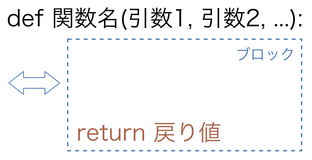 def文の最後にコロン : を置いて、次の行からインデントを入れてブロックを作るのはif文やfor文と同じである。