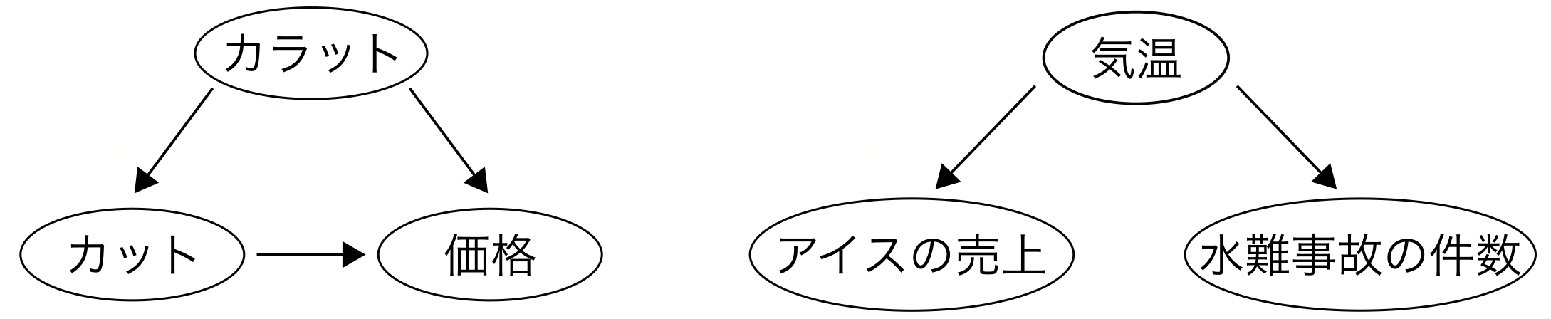 例えば、先ほどのカラットと価格の間の正の相関は、実際の因果関係を反映したものであると推測することができる。なぜなら常識的に考えて、他の条件を固定してカラットを大きくすれば、原価の分、価格も合わせて高くなるはずだからである。一方で、カットと価格の間の負の相関は、実際の因果関係を表していないと考えられる。なぜなら常識的に考えて、他の条件を固定してカットの質を上げれば、手間隙のかかる分、価格も高くなるはずだからである。