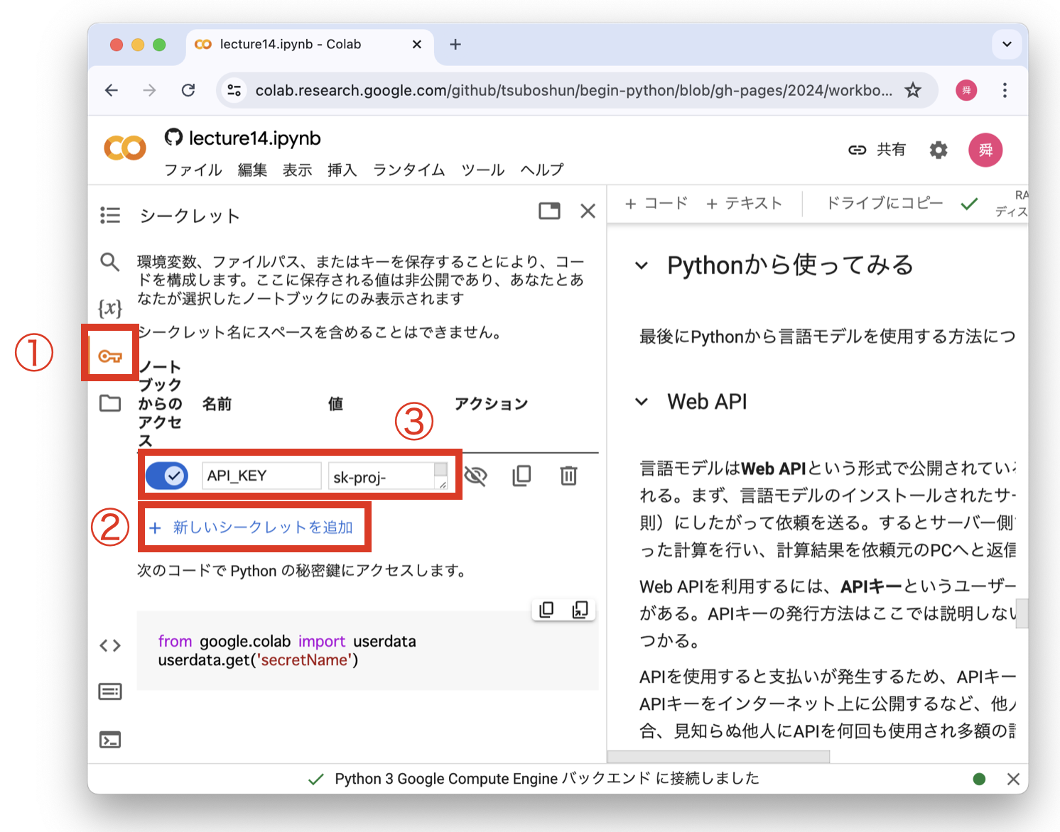 APIキーを取得したら、以下の手順でGoogle Colabに登録する。ステップ3では名前を API_KEY とし、値にAPIキーを入力することに注意しよう。