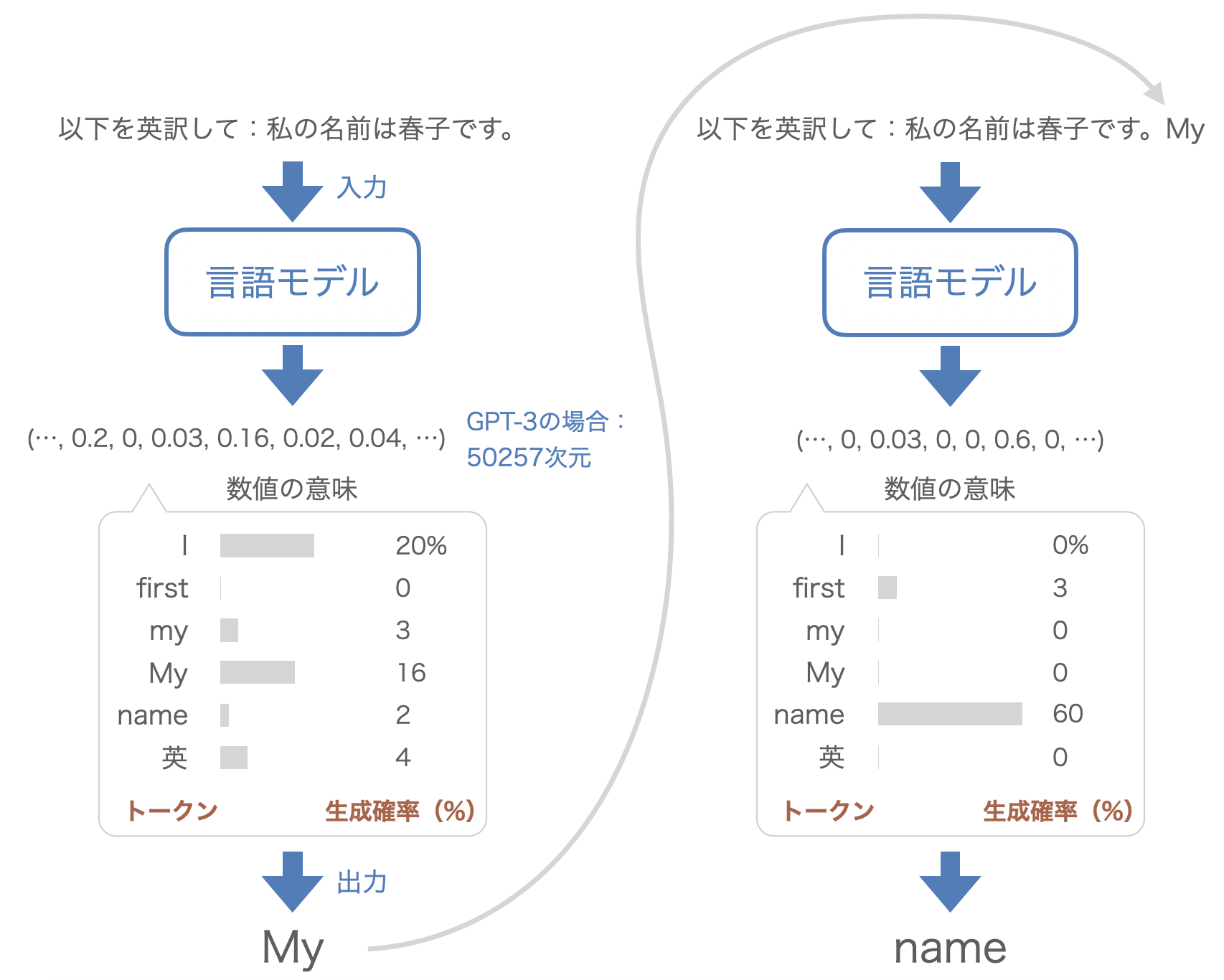 次に言語モデルに「以下を英訳して:私の名前は春子です。My」が入力され、同様に50257次元のベクトルが出力される。 今回は「name」に対応する値が大きくなっており、それを反映して「name」と出力されている。このプロセスを繰り返すことで文章を生成することができる。